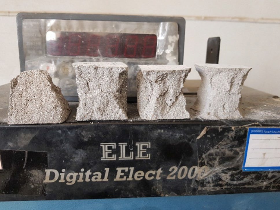 Failure of the specimens after exposure to 500 °C, for more details, see Mohamad, S., Al-Hamd, R., Khaled, T., (2020) Investigating the effect of elevated temperatures on the properties of mortar produced with volcanic ash, Innovative Infrastructure Solutions. https://doi.org/10.1007/s41062-020-0274-4